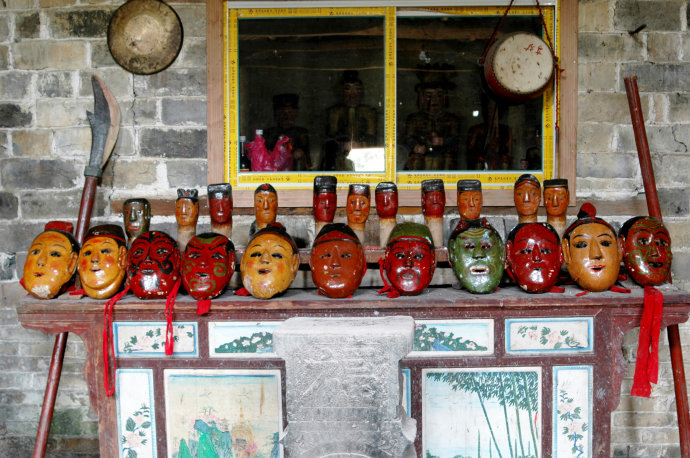 随着口和段子一根笛子独奏,时有锣鼓敲击,伴着赵公行医、大鬼小鬼双杠、单杠倒立杂技、黑白脸鬼上棚捉虱、下棚捉蛇,这些傩歌傩舞的文化空间艺术,原始的展示着《潘太公游春》故事情趣,是布帐傩之魂。