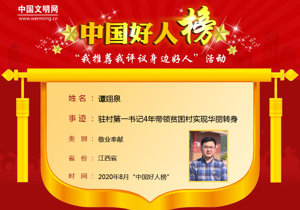 2015年,谭翊泉被单位选派参与驻村扶贫工作;2016年10月,他主动请缨担任驻村“第一书记”,四年时间,他带领一个“十三五”省级贫困村实现华丽转身,2018年2月被选举为村党支部书记。