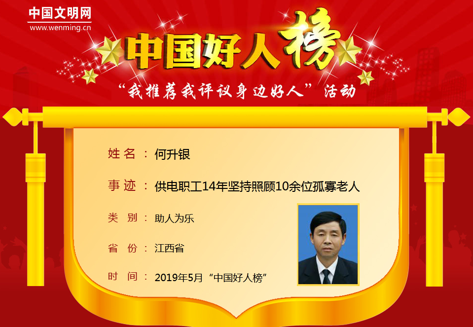 从2005年至今,何升银在工作之余帮扶孤寡老人和留守儿童十四年,积极传递友善,传播正能量,成为践行社会主义核心价值观的时代榜样。截至目前,共帮扶孤寡老人700余人次;捐资5万余元帮助老人们生活。老吾老以及人之老,他将每位老人视为自己的亲人,怀揣热忱把奉献作为生活常态。平凡又不平凡的他,浑身洋溢着永不褪色的雷锋精神,成为照亮老百姓心坎的“明灯”。感人事迹先后在国家电网动态、英大网、大江网、《九江日报》、九江电视台和电网头条等媒体报道,在当地获得赞誉。对于自己的付出,何升银总是处之淡然。他说,这是常人都能做的,没什么。但从他的平凡中,不难看出高尚所在,更体味到人间的真情与爱心的升华。在提倡文明风气、促进和谐发展的社会里,这种大爱之行只有起点,没有终点!