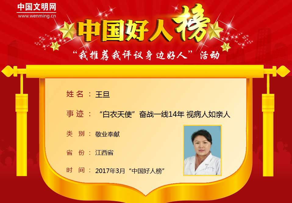王旦,女,汉族,中共党员,九江市第一人民医院体检科副主任护师。自2003年体检科成立以来,一直奋战在体检一线,默默从事健康体检管理工作14年。她爱岗敬业、乐于奉献;她认真负责、敢于拼搏;她与人为善、任劳任怨;她热情服务、视病人如亲人。她用自己的言行、善举,践行社会主义核心价值观。