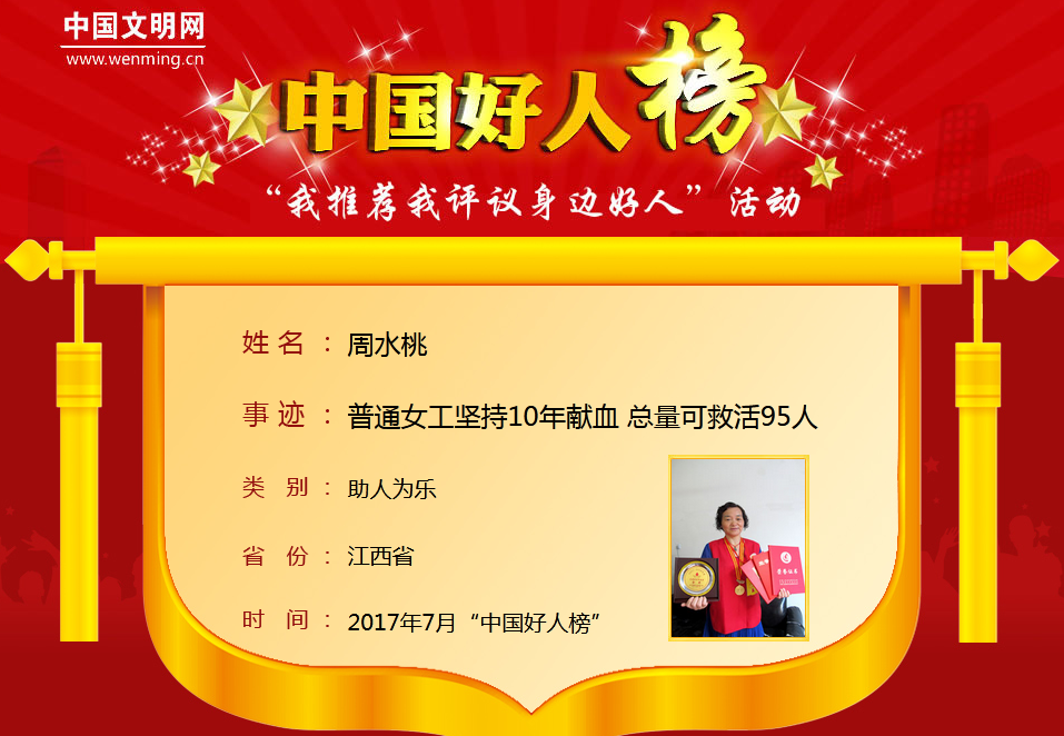 周水桃,女,现年66岁,江西省九江市德安县人,一个普通的退休工人,活跃在众多无偿献血队伍中的一员,她所献的血量能救活95个病人。