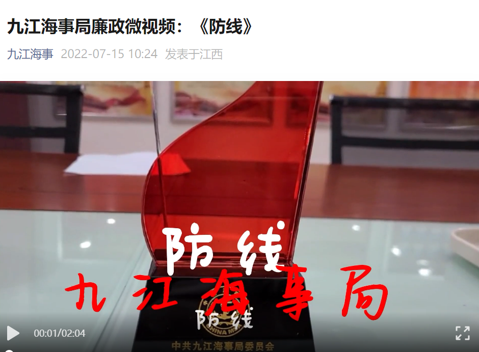 二是征集廉政文化作品。九江海事局向广大职工征集廉政文化作品,文以化人、洗心养正。各类文化作品或以文字激浊扬清、或以廉政短视频发人深省,表达出廉洁自律、拒腐防变的思想理念,弘扬了干事创业、担当作为的时代新风,传播了崇德向善、崇廉尚俭的正能量,起到了良好的宣传效果。