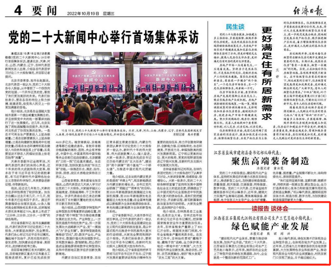 “建设现代化产业体系,要着力推动绿色发展,加快产业升级。”党的二十大代表、江西省巨石集团九江钙业有限公司生产工艺员赵小梅表示,近年来,她所在的企业走上了转型升级的绿色发展道路,如今,企业就是一个整洁如新的花园式工厂。