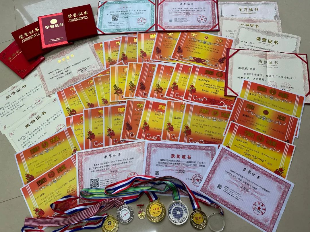 他尊敬师长,协助老师一起管理班级事务,是老师眼中的好学生,在学习的道路上,他勤勤恳恳,深知“一分耕耘一分收获”,一步一个脚印的他多次获得校级荣誉,争得区二星章、市三星章,荣获“2022年濂溪区新时代好少年” “2023年九江市新时代好少年”称号。