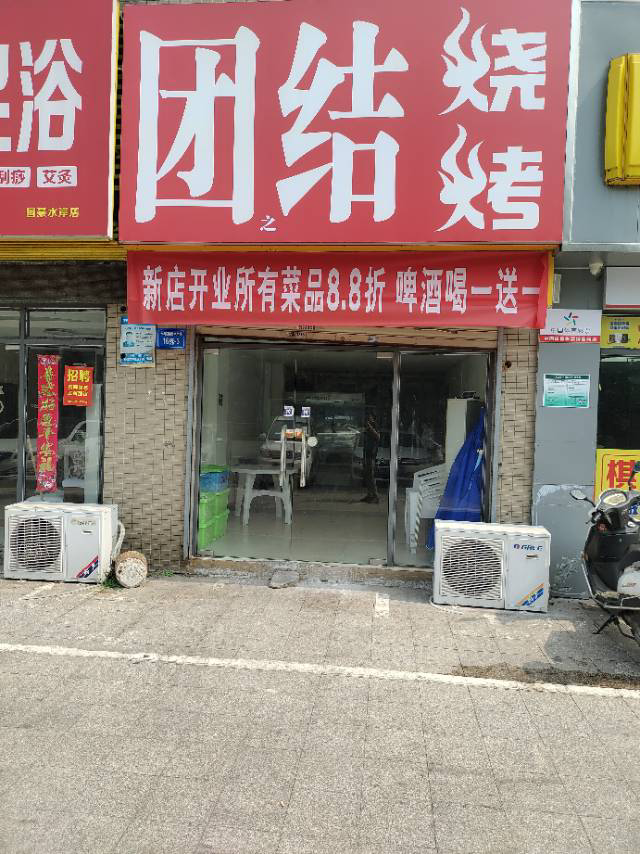 网友188****1597提供:九江市长城路105号,国豪水岸城旁边50米处团结烧烤店悬挂横幅。