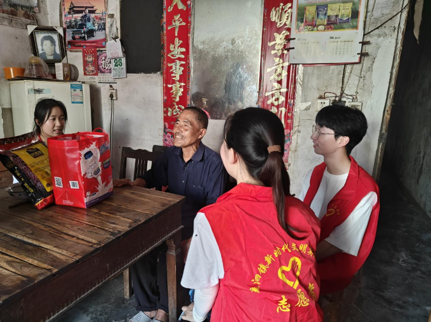 关爱弱势群体,展现人间真情与温暖。为弘扬“奉献、友爱、互助、进步”的志愿精神,流泗镇新时代文明实践所志愿者与“理学青年”社会实践服务队一同看望了空巢老人彭立成和留守儿童叶晨。志愿者来到彭立成、叶晨的家中,送去了慰问品和关怀。在看望彭立成老人并与他交流的过程中,成员们了解到彭立成是一位勤劳善良的老人,但子女们在都外地工作,老人生活在孤独和疾病之中,经过一番交流,大家也了解到老人的需求,大家纷纷表示:将继续关注彭立成老人的生活,并尽可能为他提供帮助。在看望留守儿童叶晨时,服务队的队员们与政府工作人员一起与叶晨的奶奶进行深入交流,并通过和叶晨一起聊天、画画,打开了他的心扉,成员们为他进行英语的启蒙并教他数学的进阶算法,鼓励他保持积极的心态,勇敢面对困难,并鼓励孩子们要努力学习,将来为祖国做贡献。