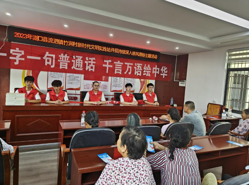 普通话走进竹涧村,让乡村与芳华时代共振。新中国成立以来,普通话作为我国法定通用语言,为加强民族、地区间交流,促进教育、文化事业发展奠定了坚实基础。为提高当地居民的语言能力与沟通水平,推进城镇化加速发展,让普通话学习推广由“要我说”转变为“我要说”,“理学青年”社会实践服务队与流泗镇新时代文明实践所志愿服务队在竹涧村居委会开展普通话宣讲活动,志愿者们与村民友好交流,宣传普通话的重要性和好处,认真教导大家常用的普通话词语词汇等,给群众分发生活用品给村民并表演了《我和我的祖国》等文艺节目,让大家感受普通话的美,充分发挥普通话提高劳动力基本素质的重要作用,让大家真正说好普通话,弘扬传承中华优秀语言文化。