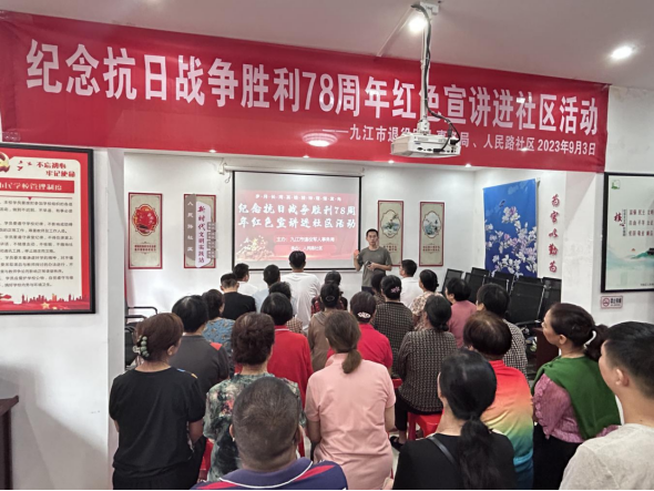 为纪念中国人民抗日战争胜利78周年,缅怀抗日英雄丰功伟绩,9月3日,九江市退役军人事务局的宣讲队员们走进浔阳区人民路社区,开展“纪念抗日战争胜利78周年红色宣讲进社区”活动。