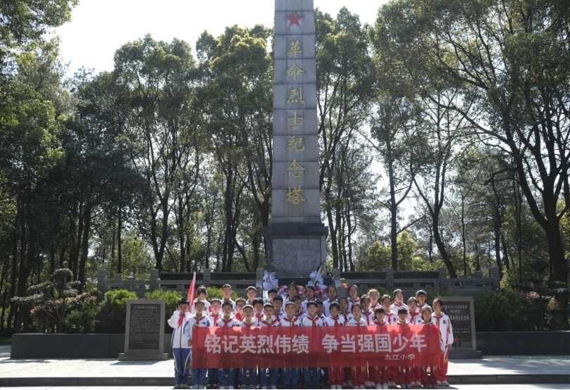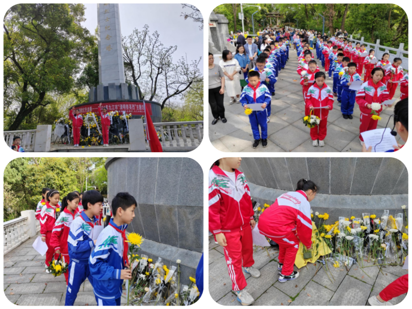 九江小学组织少先队员赴柴桑区革命烈士纪念塔开展清明祭扫活动,结合周一晨会升旗仪式开展主题教育。