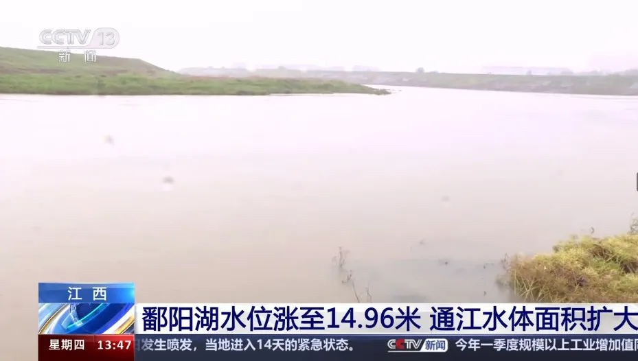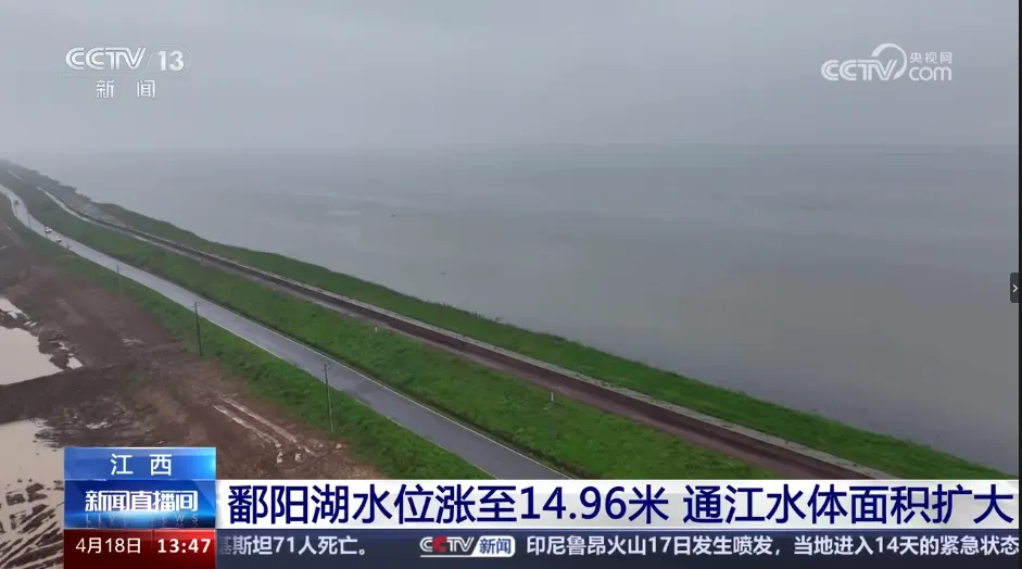 4月18日,央视《新闻直播间》栏目播出《江西 鄱阳湖水位涨至14.96米 通江水体面积扩大》,报道鄱阳湖水位快速上涨,通江水体面积扩大至2540平方公里。