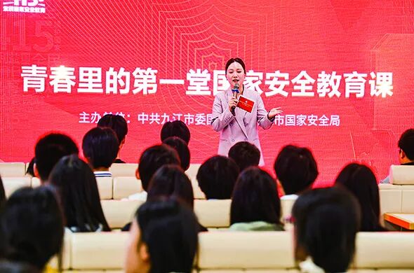 4月16日,《新华每日电讯》2版要闻版稿件《让总体国家安全观深入人心》,配发图片:4月15日,九江市活动现场上,讲解人员正在给高校学生普及国家安全知识。4月15日,九江市活动现场上,讲解人员正在给高校学生普及国家安全知识。(汪俪/摄)
