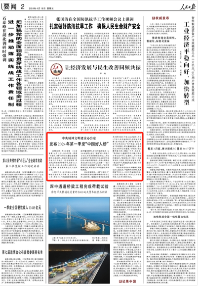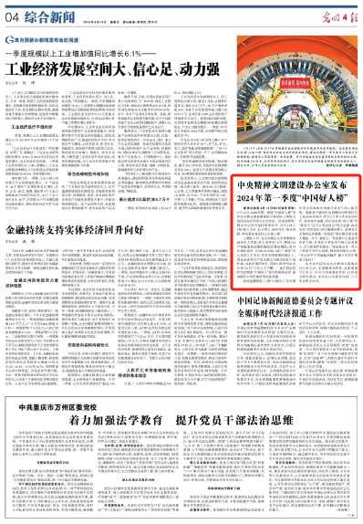 4月19日,《光明日报》4版刊发稿件《中央精神文明建设办公室发布2024年第一季度“中国好人榜”》,单条报道了2024年第一季度“中国好人榜”发布仪式暨全国道德模范与身边好人现场交流活动在九江市举办。经各地推荐、网友评议和专家评审等环节,共有152人(组)助人为乐、见义勇为、诚实守信、敬业奉献、孝老爱亲身边好人光荣上榜。中央精神文明建设办公室发布2024年第一季度“中国好人榜”