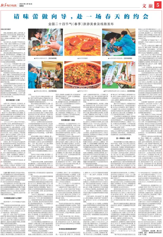 4月18日,《新华每日电讯》5版稿件《请味蕾做向导,赴一场春天的约会》,大篇幅报道了在江西省九江市修水县双井黄庭坚故里景区举办的“寻味美好中国·品游万里山河”全国二十四节气(春季)旅游美食及线路发布暨“诗旅江西”主题宣传推广活动。春始,溪流解冻。春续,云舒风涌。立春的春卷、雨水的龙须饼、清明的青团、谷雨的香椿……一捧野菜,一双巧手,简单加工就能让味蕾雀跃,可谓“一口菜,满嘴春”。