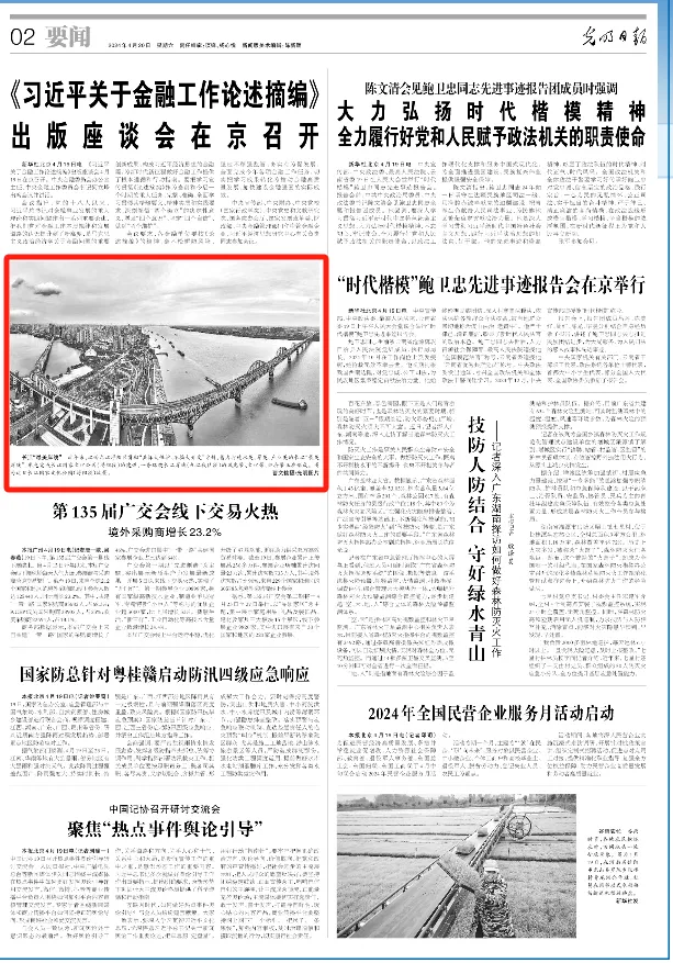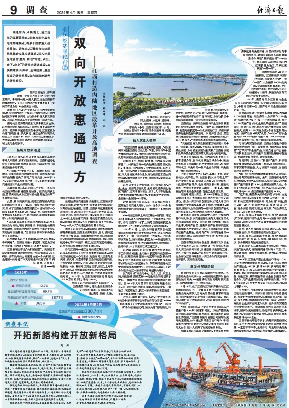 4月18日,《经济日报》9版整版稿件《双向开放惠通四方——江西打造内陆地区改革开放高地调查》,综合报道了作为江西唯一通江达海的沿江开放城市,九江市以建设区域性航运中心为重点,积极拓展开放新通道,大力发展口岸经济,激发外贸新动能,高标准高质量建设长江经济带重要节点城市。其中,稿件配发的大图均为九江的照片:长江国家文化公园九江城区段和九江湖口县方大九钢码头。