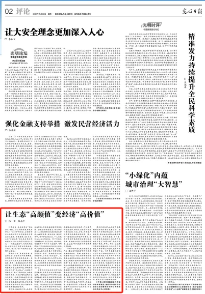 4月22日,《光明日报》2版稿件《【光明论坛】让生态“高颜值”变经济“高价值”》,提到种养结合、互相滋养的“稻蛙共生”模式,为九江共青城泽泉乡带来了“1+1>2”的效益。种养结合、互相滋养的“稻蛙共生”模式,为江西共青城泽泉乡带来了“1+1>2”的效益;全国首单水土保持生态产品价值转化交易在浙江落地,交易额达3328万元;山东“负碳海岛”灵山岛省级自然保护区生态产品核算总值近6亿元……从陆地到海洋,从动物到植物,通过生态产品价值实现机制,一场点“绿”成“金”的创新正在全国加速落地。