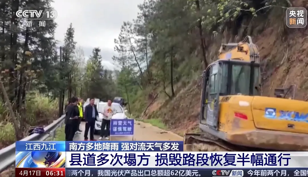 4月17日,央视《朝闻天下》栏目播出《南方多地降雨 强对流天气多发 江西九江 县道多次塌方 损毁路段恢复半幅通行》,报道强对流天气导致九江修水县一处县道发生塌方,当地第一时间组织专业力量到现场进行管控和处置,目前已恢复半幅通行。