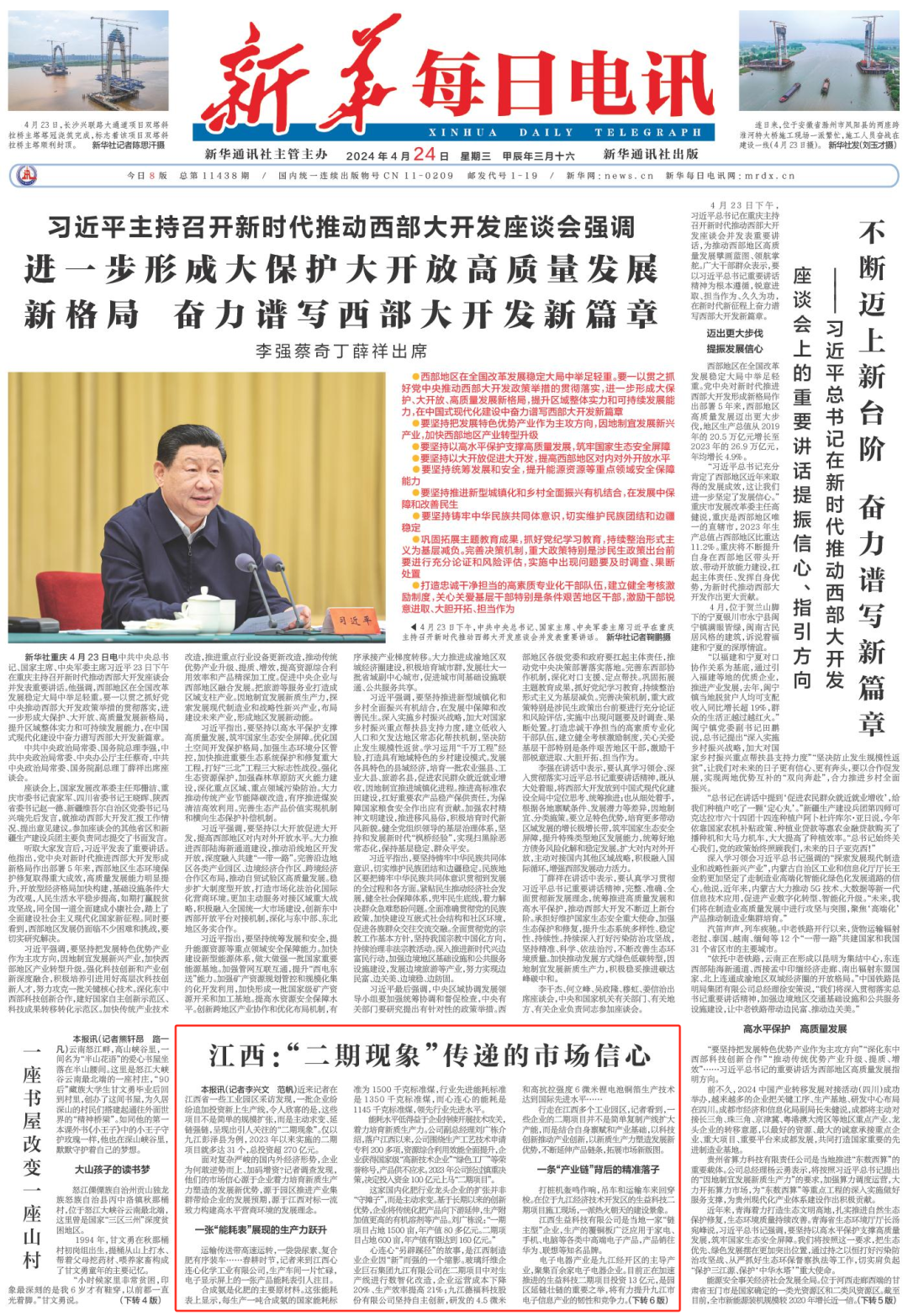 4月24日,新华每日电讯头版调查稿件《江西:“二期现象”传递的市场信心》,单条报道了彭泽县、九江经开区等一大批企业主动求变、延链强链,纷纷追加投资新上生产线,呈现出引人关注的“二期现象”。调查发现,他们的市场信心源于企业着力培育新质生产力塑造的发展新优势,源于园区推进产业集群带给企业的发展预期,源于对标一流致力构建高水平营商环境的发展理念。