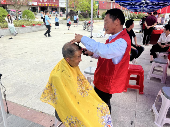 在广场“爱心义剪”服务摊位。志愿者一边为居民理发,一边和他们唠家常,耐心地倾听居民修剪要求。一推一剪,手法娴熟,一会儿,一张张面孔容光焕发。