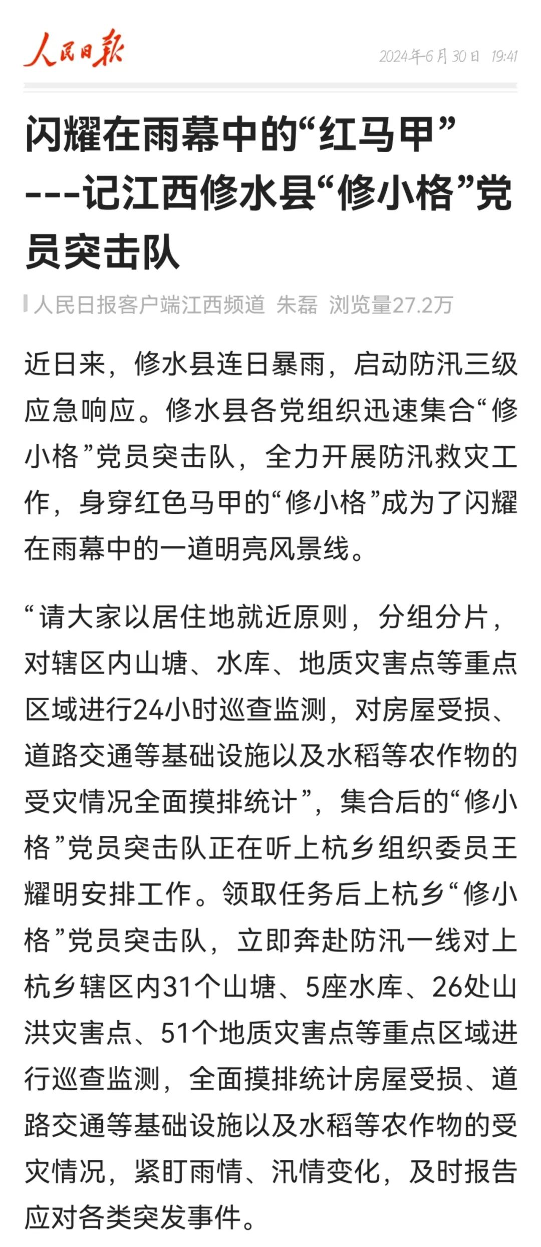 6月30日,人民日报客户端发布《闪耀在雨幕中的“红马甲” ——记江西修水县“修小格”党员突击队》,聚焦修水县各党组织迅速集合“修小格”党员突击队,全力开展防汛救灾工作,身穿红色马甲的“修小格”成为了闪耀在雨幕中的一道明亮风景线。