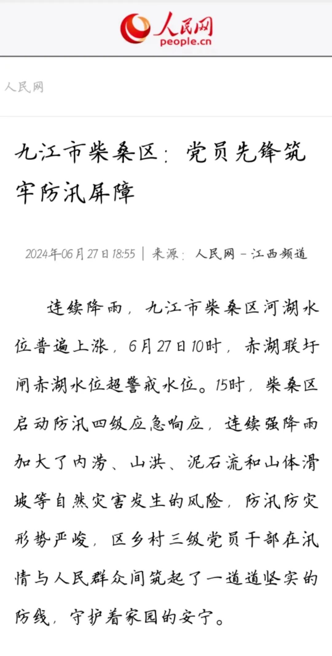 6月27日,人民网发布《九江市柴桑区:党员先锋筑牢防汛屏障》,报道柴桑区区乡村三级党员干部在汛情与人民群众间筑起了一道道坚实的防线,守护着家园的安宁。