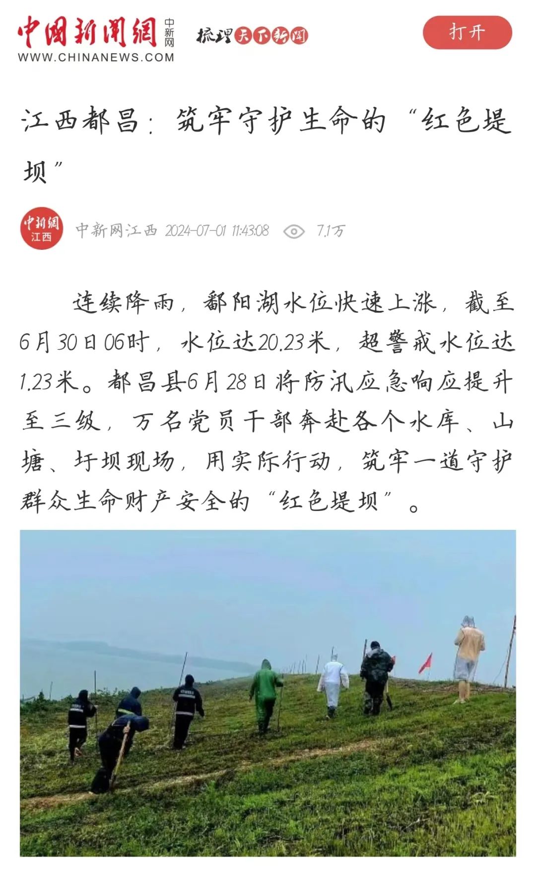 7月1日,中国新闻网发布《江西都昌:筑牢守护生命的“红色堤坝”》。关注都昌县万名党员干部奔赴各个水库、山塘、圩坝现场,用实际行动,筑牢一道守护群众生命财产安全的“红色堤坝”。