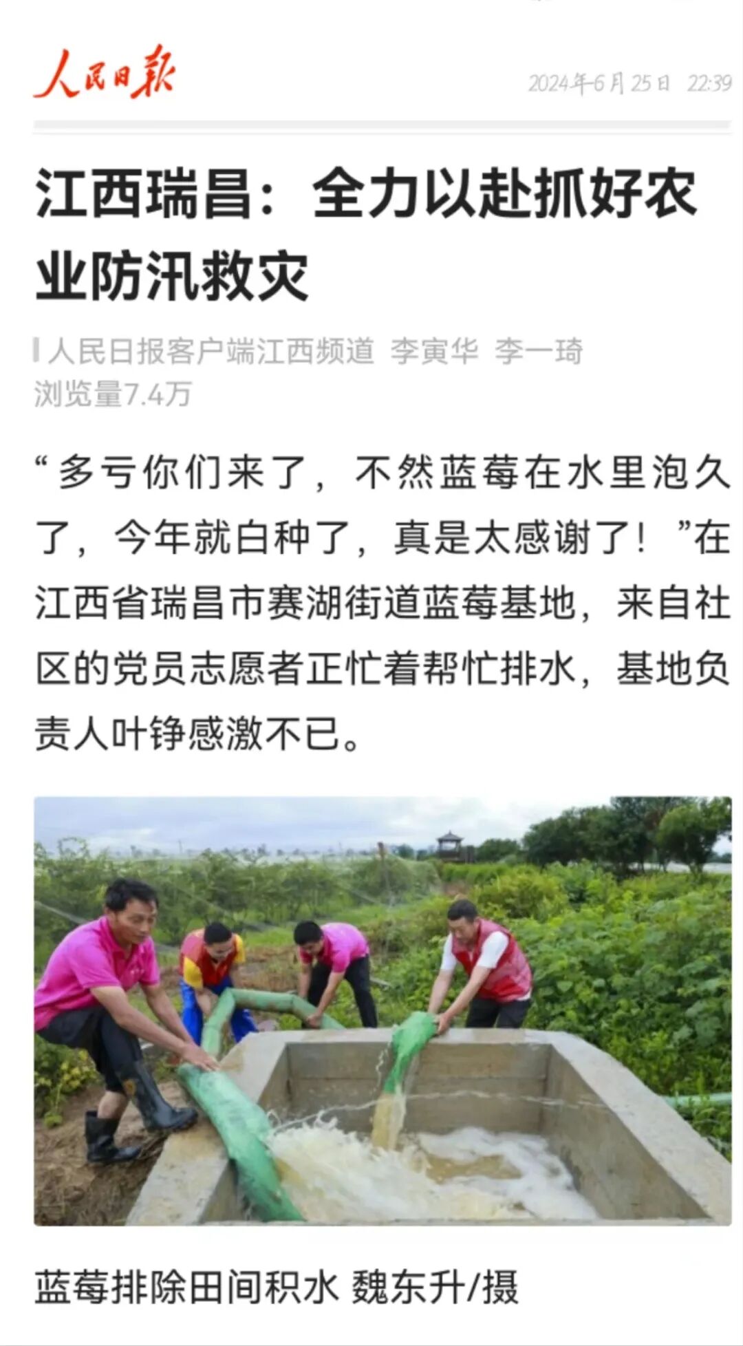 6月29日,人民日报客户端发布《江西彭泽:防汛一线党旗红》,报道彭泽县各级党组织和广大党员干部闻“汛”而动,向“险”而行。