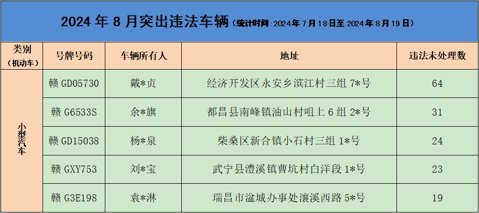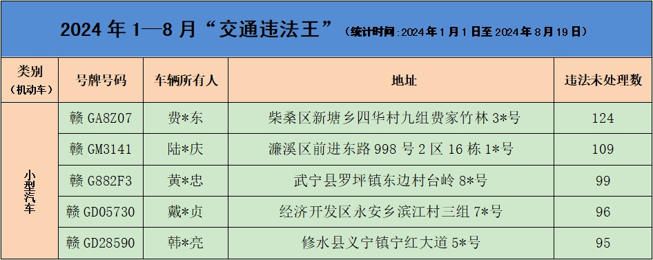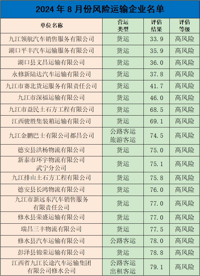为有效预防和减少道路交通事故,保护人民群众生命财产安全,保持道路交通安全形势持续稳定。根据省公安厅交管局统一部署,九江市公安局交通管理支队持续开展宣传警示曝光行动。本次重点曝光2024年8月份的突出违法车辆、风险运输企业名单、事故多发路段、终生禁驾人员名单和典型事故案例(简称“五大曝光”)。