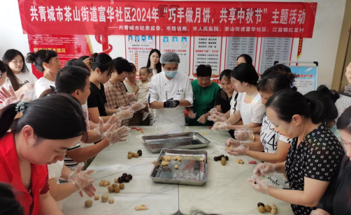 近日,共青城市富华社区新时代文明实践站联合共建单位开展了“巧手做月饼,共享中秋节”主题活动,让辖区居民群众体会中华优秀传统文化的魅力。活动开始,工作人员向大家分发称好重量的原料和工具,随后工作人员现场示范制作月饼的步骤,随后,大家纷纷化身月饼师傅,在欢声笑语中,精美的月饼逐渐成型。烘焙过后的月饼新鲜出炉,一个个焦黄油亮看起来非常诱人,香味飘满了整个活动室,大家品尝着自己制作的月饼,个个脸上露出满满的成就感。随后大家小心翼翼地将做好的月饼放进精美的月饼袋中,居民纷纷与自己亲手制作的月饼合影留念。