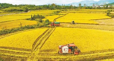 图为江西都昌县蔡岭镇,农机在田间抢收水稻。傅建斌/摄(人民视觉)