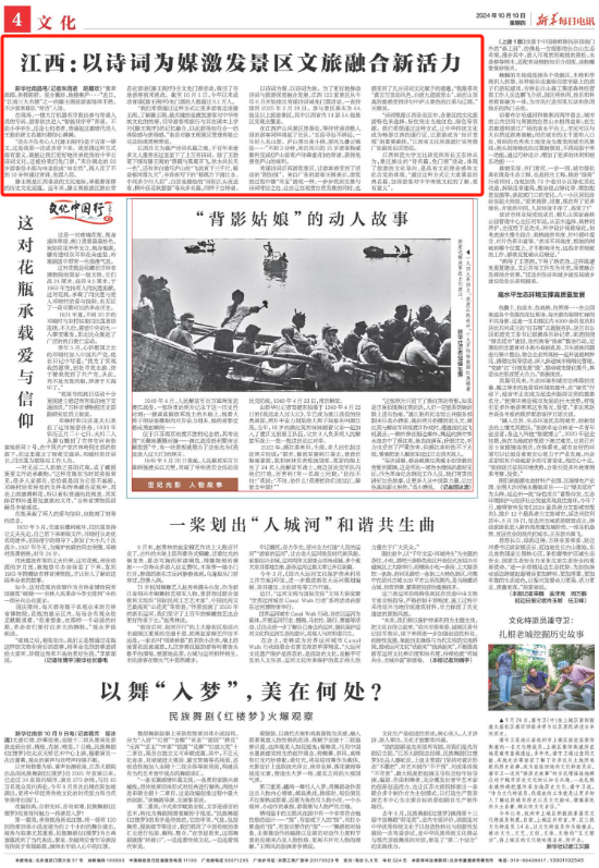 10月10日,《新华每日电讯》4版头条稿件《江西:以诗词为媒激发景区文旅融合新活力》,其中报道了庐山风景区开展的背诵诗歌免门票活动吸引了游客广泛参与。背诵诗词后再游览景区,让游客感受到了活动的“附加值”。