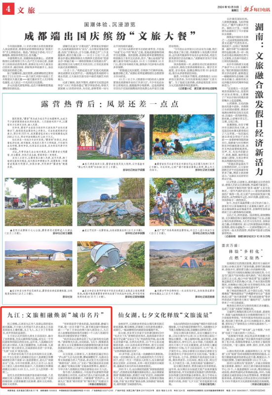 10月9日,《新华每日电讯》4版稿件《九江:文旅相融焕新“城市名片”》,单条报道了近年来,八里湖新区通过打造九派云驿站、九派之眼露营地、九派诗廊、九派夜市等一批文旅项目,举办“庐山杯”九江马拉松赛、赛城湖樱花节、九派诗会等文体旅融合的人气活动,区域旅游业态进一步丰富,“九派”文化IP愈发闪亮。
