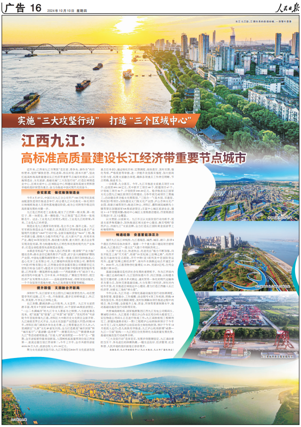 近年来,江西省九江市聚焦“走在前、勇争先、善作为”的目标要求,坚持“解放思想、开拓进取,扬长补短、固本兴新”,坚决扛起高标准高质量建设长江经济带重要节点城市的使命,以实施制造业、文化旅游、基础设施“三大攻坚行动”,打造区域制造业中心、区域文旅中心、区域航运中心和建设富裕美丽文明和谐幸福的美好家园为重点,奋力为推进中国式现代化而奋斗。