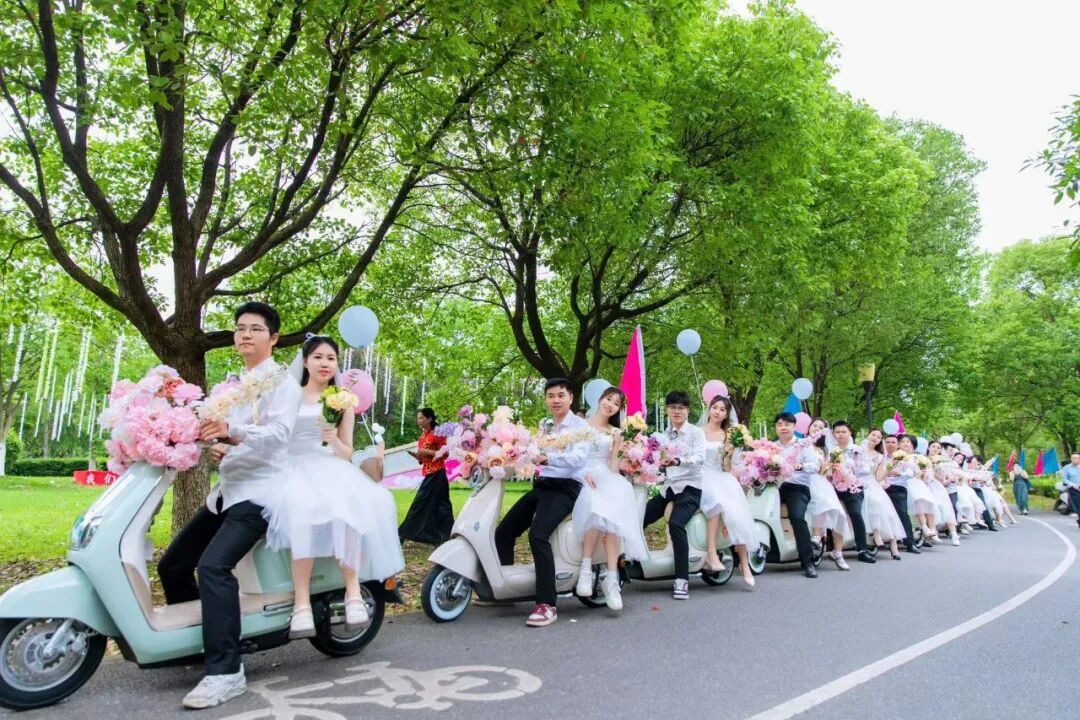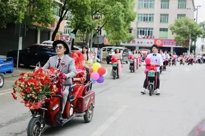 在吉安市新干县举办的“幸福520,婚嫁新风尚”低碳集体婚礼暨集体颁证活动中,新郎骑电动车接亲,让接亲队伍体验了一把婚事新办、喜事简办的仪式感……
