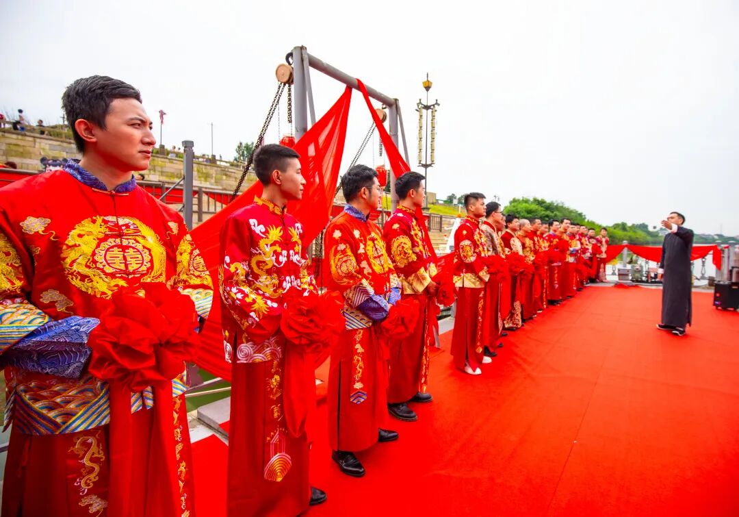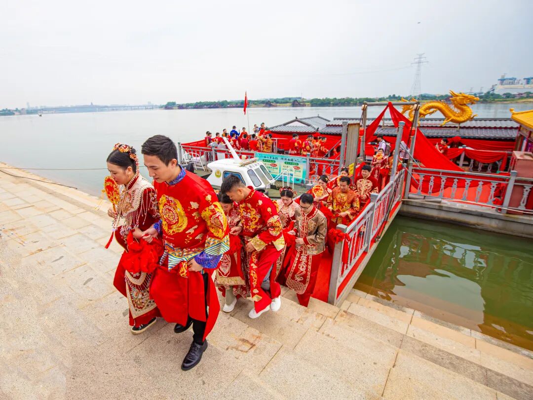 新郎们正列阵在丹砂渡码头,迎接自己的心上人乘船而来……佳人登岸,伸手迎接,携手并肩举案齐眉,走向美好未来。