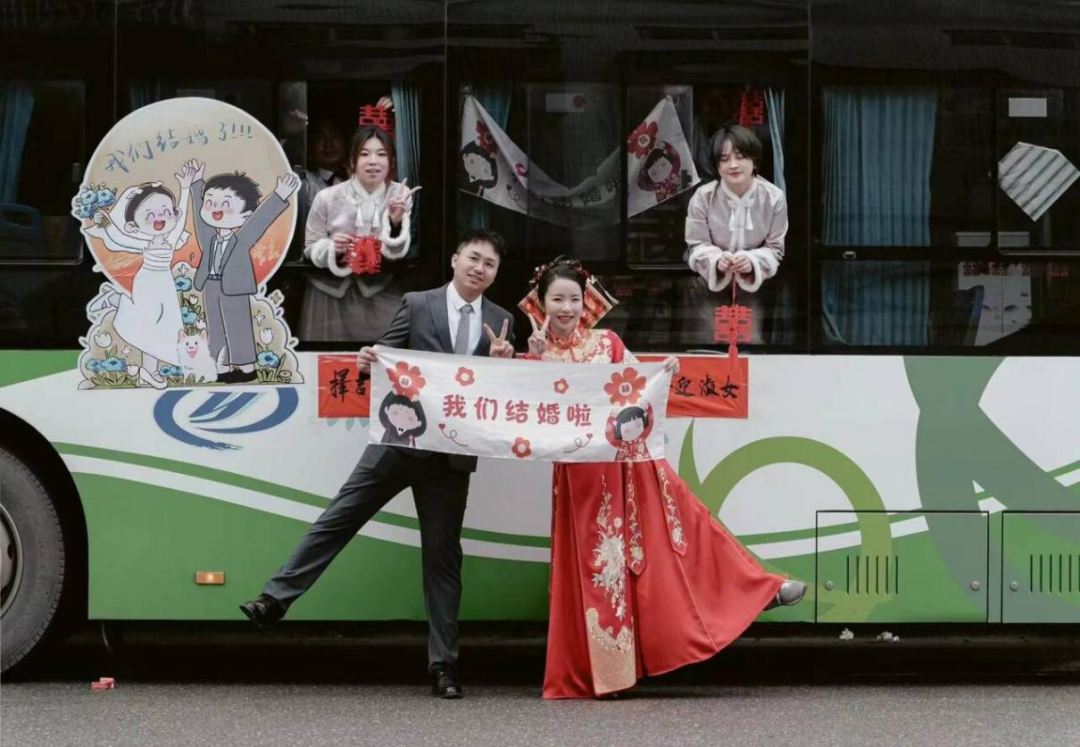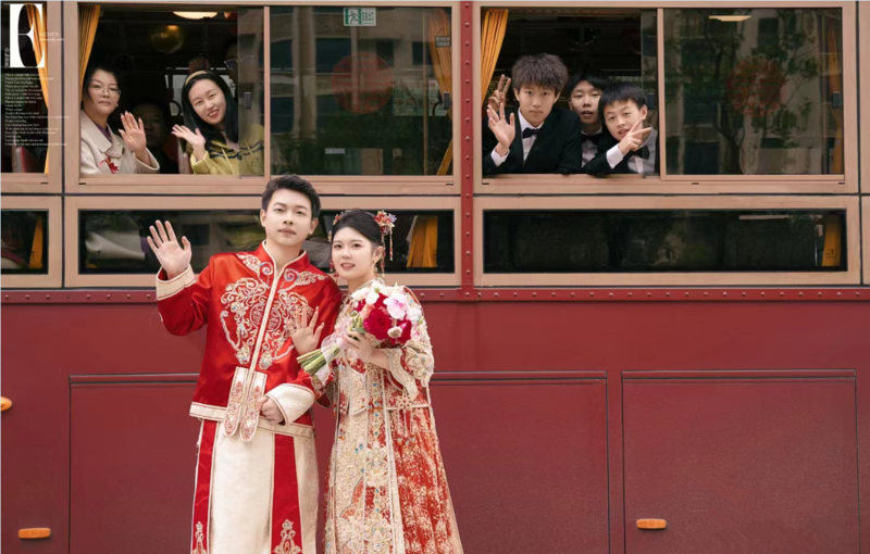 “租赁公交车当婚车,是我们共同的想法。”方坤说,传统婚礼通常需要租赁6辆至8辆小轿车,大约需要5000元,而且亲朋好友分散坐,接亲路上基本没有交流。“我们特别想要一场热闹又特别的婚礼,红色的‘铛铛车’外形喜庆又好看,正好能满足我们的需求。”