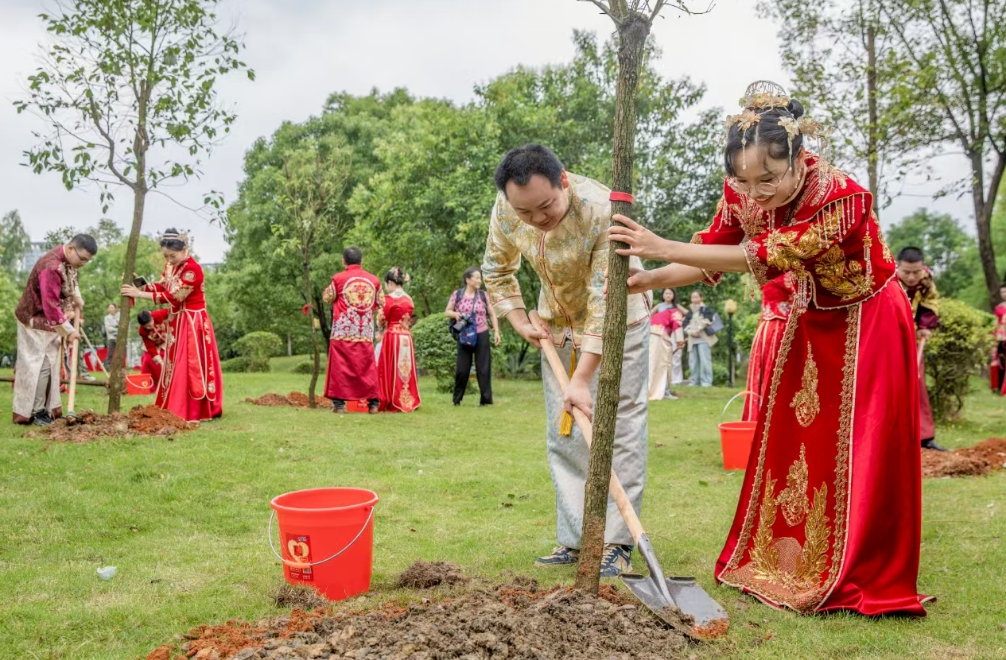 今年5月20日,在这个特殊的日子里,袁州区16对新人在集体婚礼仪式结束后积极响应“有喜事,来种树”的倡议,来到袁州公园,挥锹铲土,共同种下爱情树,共植爱情林,用实际行动践行文明理念。
