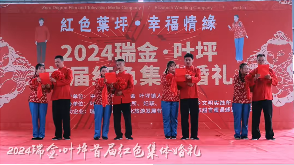 16对“零彩礼、低彩礼”的新人,在亲朋好友的见证与祝福下喜结连理,倡导喜事新办、婚事简办的文明新风。婚礼现场,鼓声敲响,乐声鸣奏,新人们手牵大红绣球绸带,在司仪引导下,行却扇礼、互拜礼、沃盥礼、同牢礼、合卺礼、结发礼、执手盟誓礼。