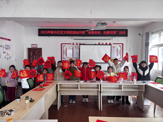 1月15日,永修县涂埠镇新兴社区新时代文明实践站开展“非遗传承,拓趣无限”活动。志愿者耐心地向小朋友们讲解拓印方法及技巧。随后在志愿者的细心指导下,孩子们将刻有福字的塑料膜覆盖在红纸上,一只手压住红纸,一只手用海绵刷蘸取颜料,小心翼翼地涂抹开来,不一会儿圆润饱满、寓意吉祥的“福”字便跃然纸上。