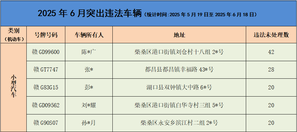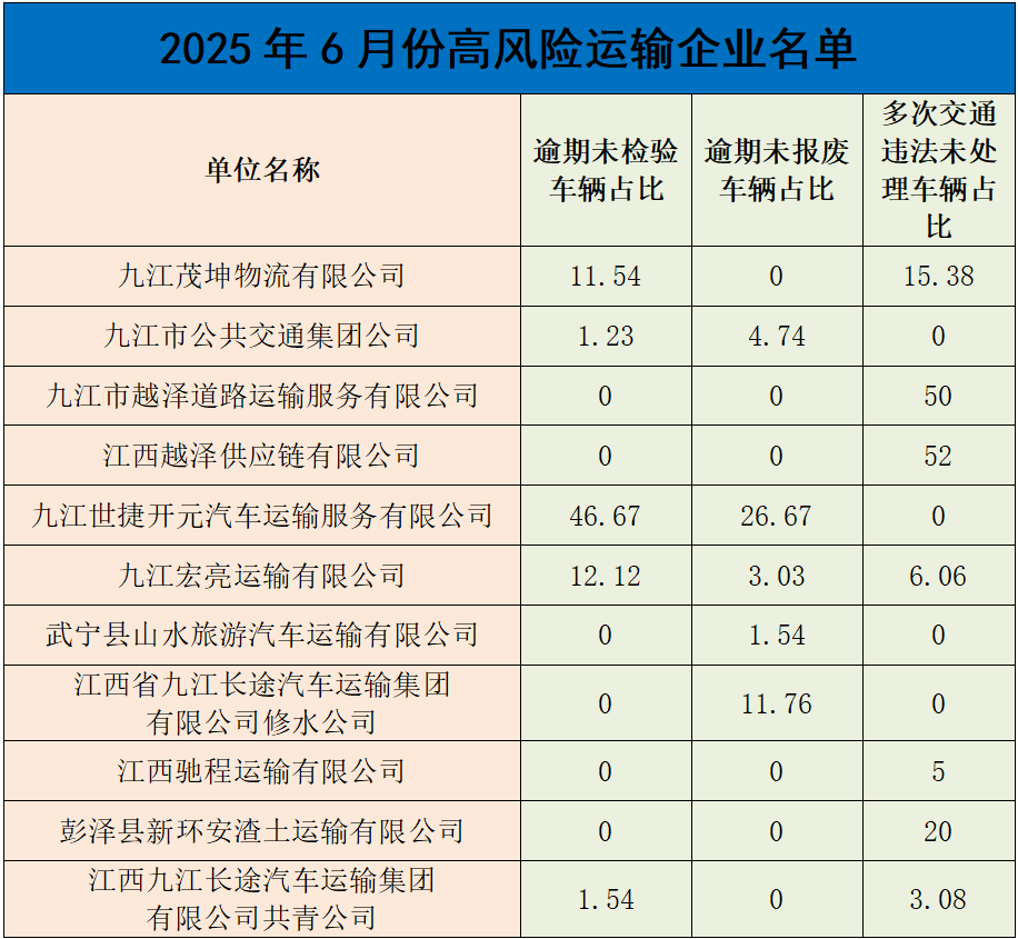 为有效预防和减少道路交通事故,保护人民群众生命财产安全,保持道路交通安全形势持续稳定,九江市公安局交通管理支队持续开展宣传警示曝光行动。本次重点曝光2025年6月的突出违法车辆、风险运输企业名单、事故多发路段、终生禁驾人员名单和典型事故案例(简称“五大曝光”)。